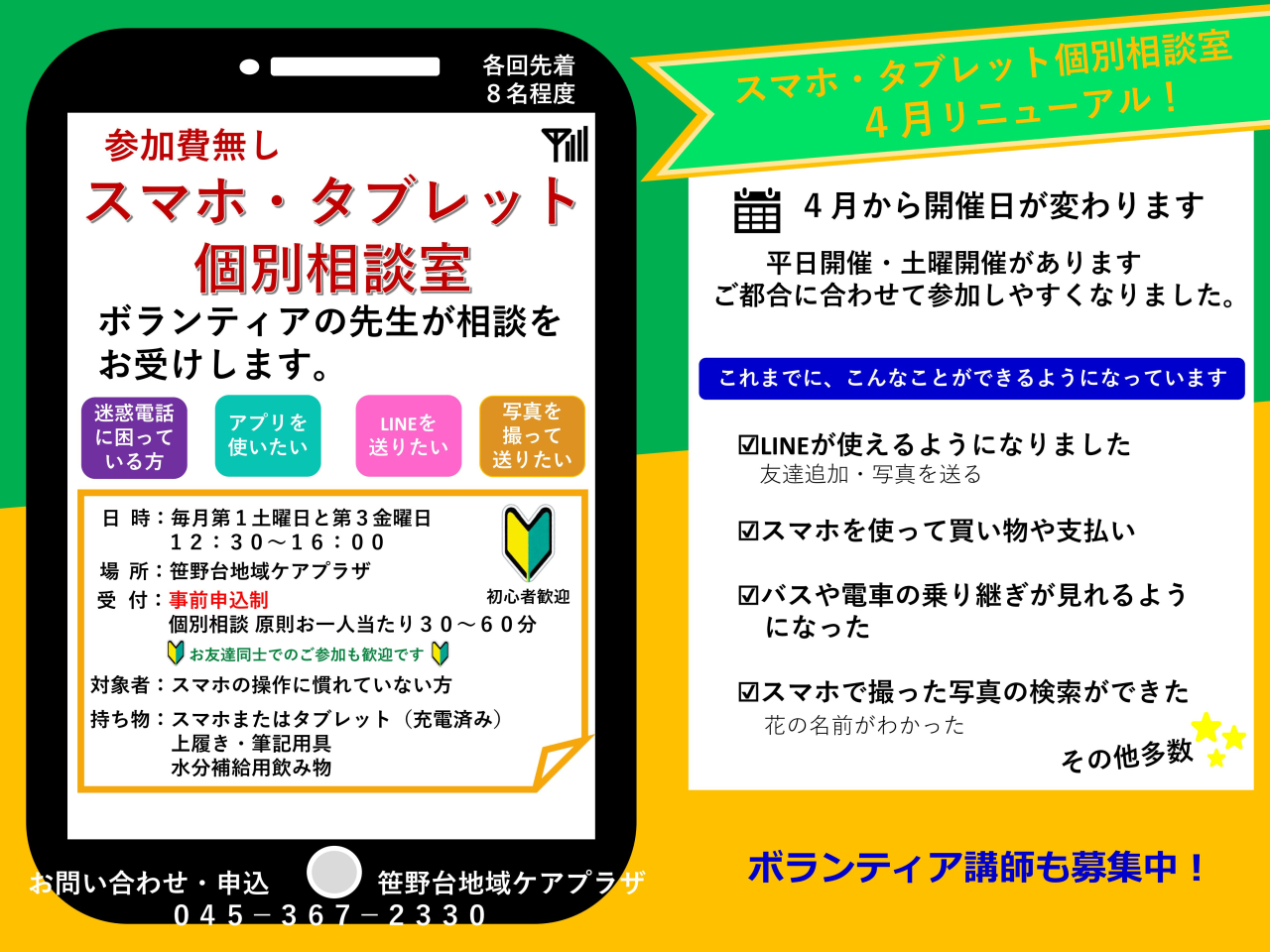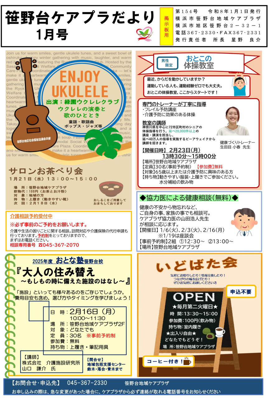 地域の皆さまに福祉・保健等に関する活動や交流の場として「多目的ホール」や「ボランティアコーナー」等をご利用いただくとともに、介護教室などの各種講座を企画・実施して、地域の支えあいの輪を広げます。