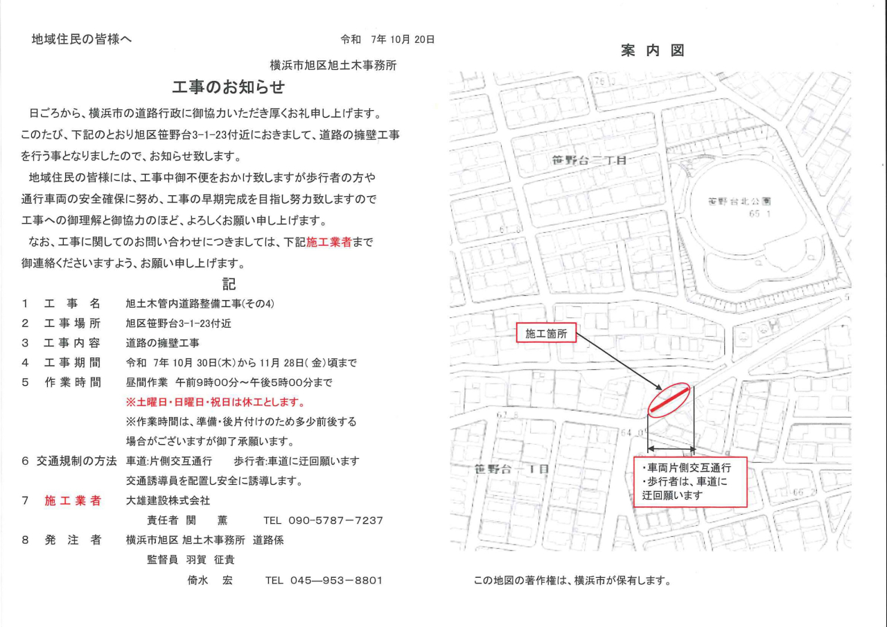 金が谷道、笹野台会館南側より笹野台商店街へ続く歩道について旭土木事務所による整備工事が始まります。連合自治会としての協力要請(㋈交渉、10月現場立会い)について、ほぼ応じてくれることになりました。