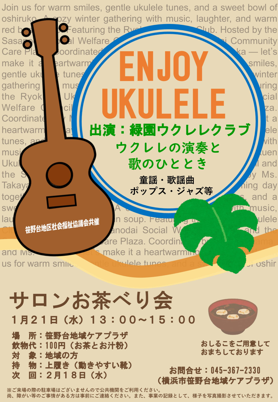 サロン『お茶べり会』は、毎月第3水曜日に笹野台地域ケアプラザに集まり、みんなでお茶を飲みながら、昔ばなしや世間ばなしに花を咲かせたり、情報交換や友達づくりの場として、また趣味や興味のあることにチャレンジをするなど、自由に使っていただく時間です。
