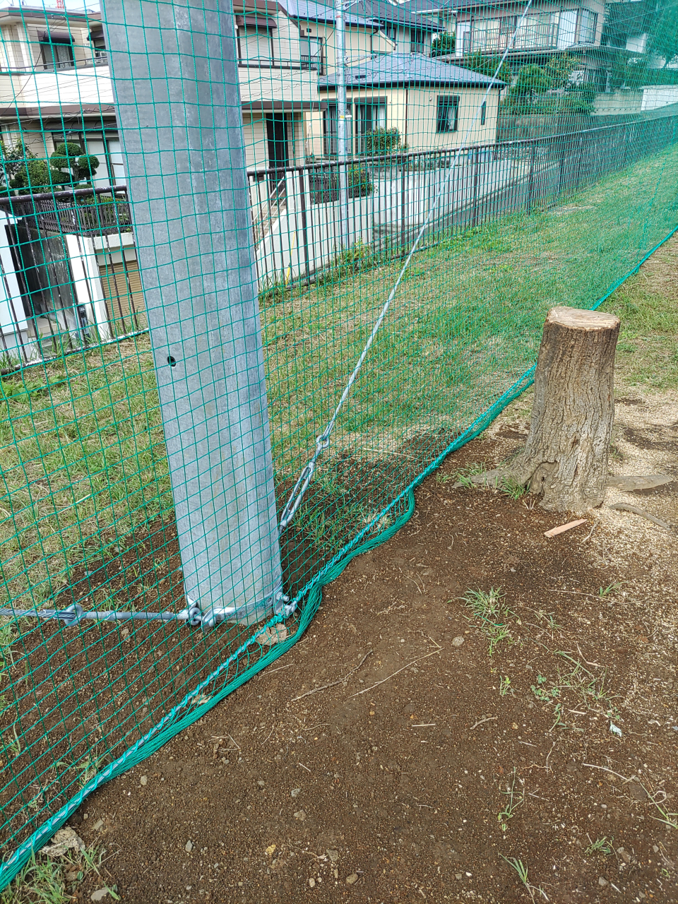 この点については、現状、利用団体のみなさんに理解してもらい、危険を十分に排除すべく、自粛協力をいただいています。今回の一部防球ネット延伸は、レフト外側、南に向かって一部延伸(つぎ足し)したものです。レフト側に大きなファウルボールが間違って打ち込まれても、公園外に極力出さないための細工です。