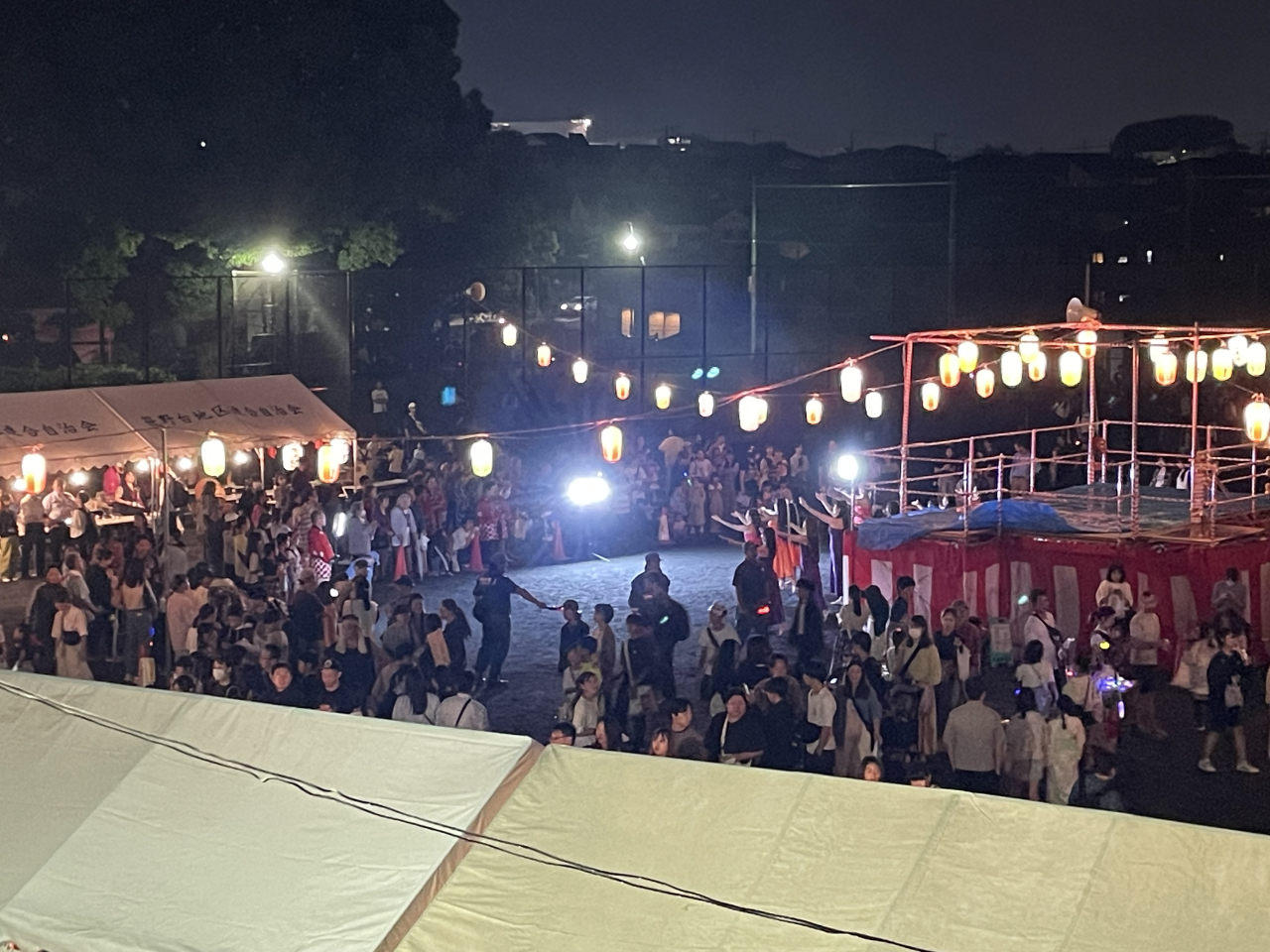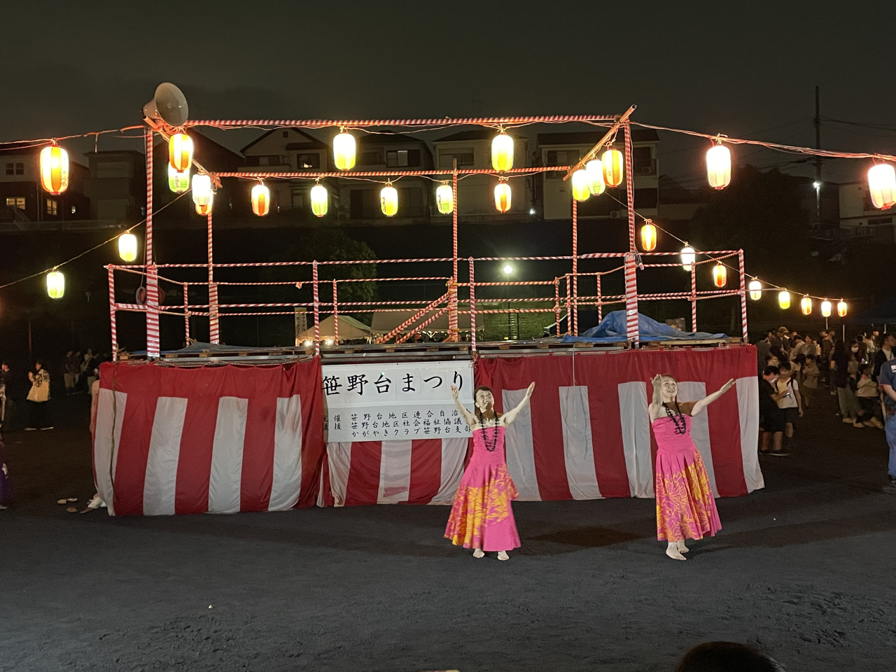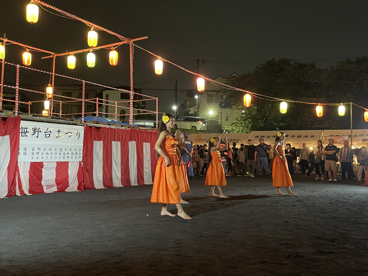をテーマに、今年は思い切って日程変更しました。時間についても1時間繰り上げ準備し、当日を迎えました。初日は少雨とはいえ降り続く雨で、アトラクションでお呼びした横浜隼人中高等学校の和太鼓部30人余のパーフォーマンスは期待でわくわくでしたが、やむなく中止としました。その後、笹野台笹太鼓がテント内で演奏し会場を盛り上げてくれました。時間経過とともに雨が上がり、盆踊りやフラダンスは予定通り、大人も子どもたちも華やかに賑やかに祭りを楽しみました。
